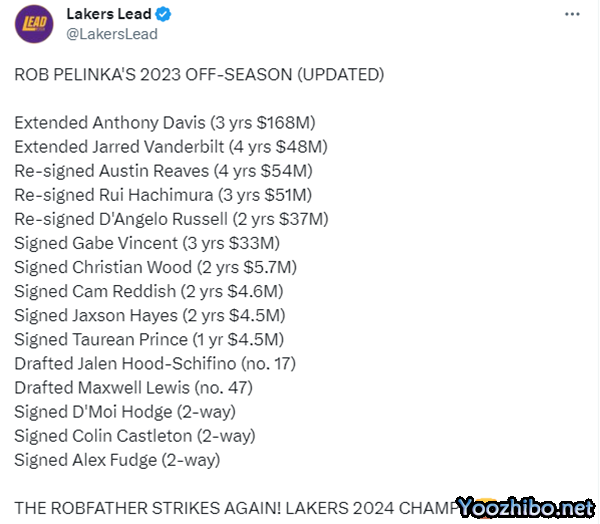 上赛季詹姆斯和浓眉带领湖人在交易截止日之后强势逆袭,并且带队杀进西部决赛,可惜西决惨遭掘金横扫;今夏湖人围绕詹眉打造新的冲冠阵容,佩总完成多笔超值签约,比如续约里夫斯、范德彪等人。