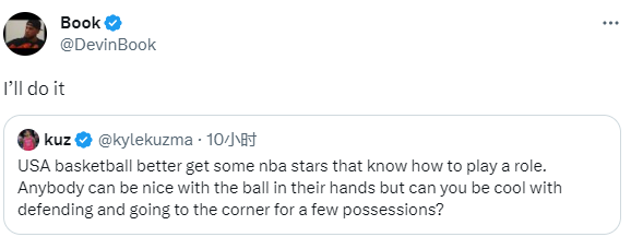 此前库兹马表示美国男篮需要一些有能力且愿意服从安排以及干苦活的球星,发推写道:美国男篮最好找一些懂得如何发挥自己角色的NBA球星。任何人持球在手都能够打得很棒,但你能够冷静地去防守和在一些回合中去底角吗?