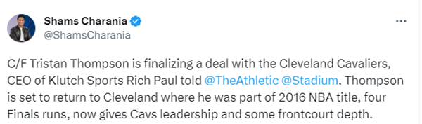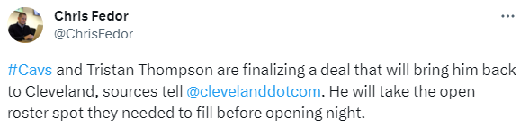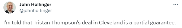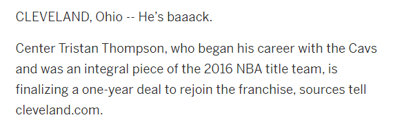 32岁的特里斯坦-汤普森重返骑士,骑士随队记者Chris Fedor跟进报道,汤普森与骑士签下的是一份为期一年的合同;另一位记者John Hollinger表示,汤普森新赛季的合同为部分保障。