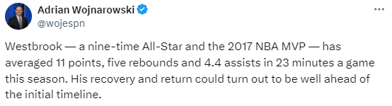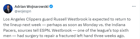对于快船来说,威少即将复出是一个重大利好,威少的侵略性和能量,将帮助球队全力冲击西部前三。
