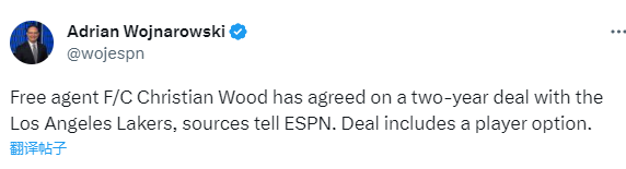 来源:24直播网09-06 16:4524直播网09月06日,据espn名记woj报道,伍德2年合同加盟湖人,合同中包含球员选项;伍德成为湖人队第14人,新赛季辅佐詹姆斯和浓眉冲击总冠军。