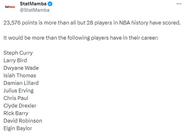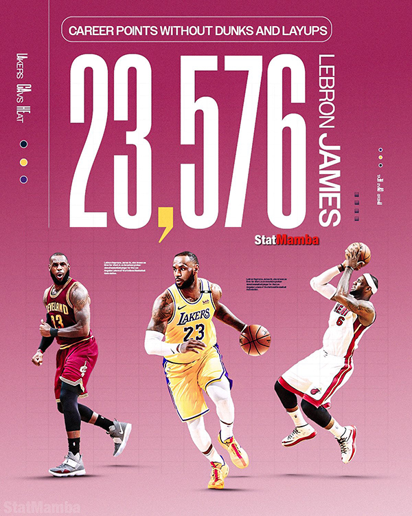 美媒StatMamba统计,如果去掉詹姆斯的所有上篮及扣篮得分,他的生涯总得分为23576分,排名历史第29位;即使如此,詹姆斯生涯总得分仍高于以下NBA名宿或现役球星的生涯总得分:斯蒂芬-库里、拉里-伯德、德维恩-韦德、伊赛亚-托马斯、达米安-利拉德、朱利叶斯-欧文、克里斯-保罗、克莱德-德雷克斯勒、里克-巴里、大卫-罗宾逊和埃尔金-贝勒。