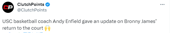 近日,南加州大学教练Andy Enfield谈到布朗尼的情况,他表示:好消息是他表现的非常好,而且他现在正在上课。我们都爱他,我认为每个人都希望布朗尼能够重返球场,我们必须要有耐心,一步一步来。”