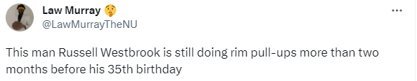 看到威少的扣篮视频,快船记者Joey Linn发推写道:威少即将开始生涯第16年仍旧狂野;Law Murray表示再过2个月,威少就35岁了,这个男人仍旧暴扣并且在篮筐上做引体向上的动作。
