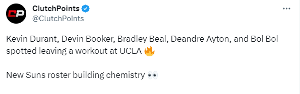 今年夏天,太阳队围绕杜兰特和比尔打造新的冲冠阵容,通过三方交易送走保罗、沙梅特以及选秀权,最终得到比尔;太阳还交易佩恩以及签下波尔-波尔、渡边雄太、尤班克斯等人;本来太阳计划交易艾顿,但艾顿没什么交易市场,最终太阳决定留下艾顿。