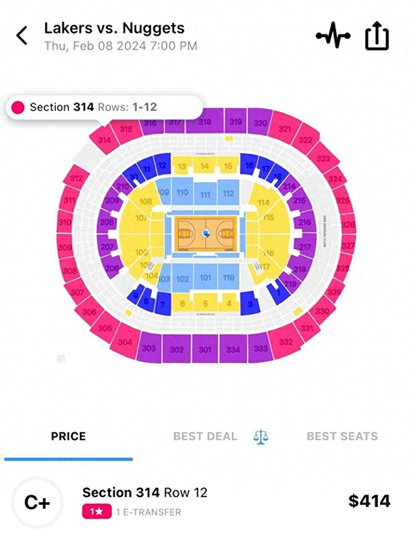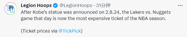 据悉,科比雕像揭幕日当天比赛的票价,是整个赛季最贵的。最便宜的座位(顶棚附近),目前的价格已经达到414美元。