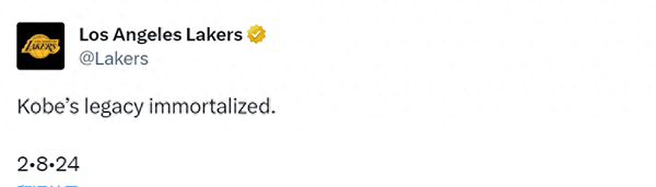 来源:24直播网08-25 11:3524直播网08月25日讯,湖人官方宣布,为了纪念科比,球队将于当地时间2024年2月8日揭幕位于主场球馆前的科比雕像。这一消息是在当地时间8月24日,也就是“科比日”发布的。他们敲定的揭幕时间也很有意义:2是科比女儿Gigi的球衣号,8和24是科比的球衣号。科比雕像揭幕日当天比赛的票价,是整个赛季最贵的。