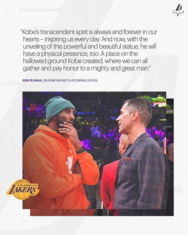 湖人队总经理罗布·佩林卡表示:“科比的超越精神永远在我们心中——每天都在激励着我们。现在,随着这座壮观的雕像的揭幕,他也将拥有实体存在。 在科比创造的神圣土地上,我们可以聚集在一起,向一位强大、伟大的人致敬。”