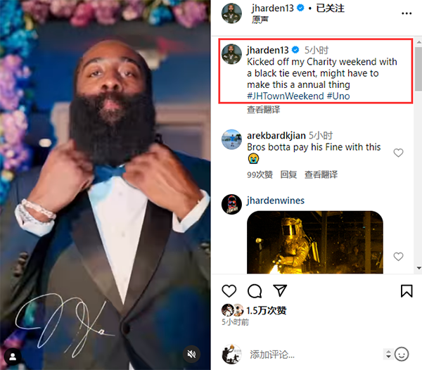 哈登被重罚后仍旧更新社交媒体,晒出自己尽享派对的画面,配文写道:以一场黑领结活动拉开了我慈善周末的序幕,可能不得不让这成为一件一年一度的大事情。