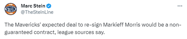 独行侠裁掉麦基后,他们将重新签下自由球员大莫里斯。据名记Stein报道,大莫里斯将与独行侠签下一份无保障合同,合同金额约为202万美元。