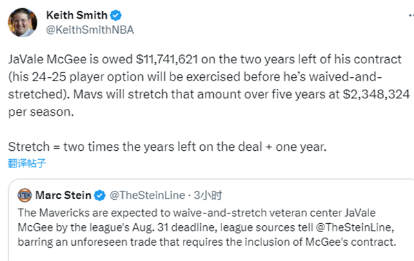 Keith Smith进一步报道,麦基的合同还剩下两年,24-25赛季为球员选项,独行侠需支付麦基1174万1621美元,使用延伸条款球队将分5年支付这笔薪资,每个赛季给麦基234万8324美元。