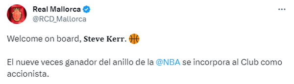 勇士主教练史蒂夫-科尔正式成为皇家马洛卡俱乐部的股东之一,NBA名宿史蒂夫-纳什也是这支球队的股东。