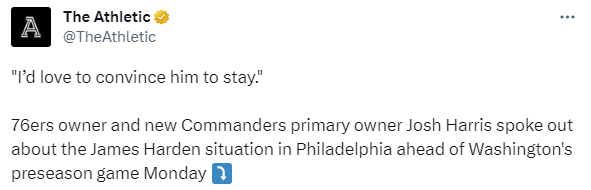 近日76人老板约什-哈里斯接受了美媒TA的采访,谈到了哈登申请交易且不想再为76人效力一事。