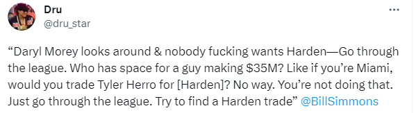 对于哈登闹剧,名嘴比尔-西蒙斯表示整个联盟没人想要哈登,谁有空间容纳一个年薪 3500 万美元的人?就像如果你是迈阿密热火,你会用泰勒·赫罗换哈登吗?决不。你没有那样做。只有通过新赛季才可以继续尝试交易哈登。