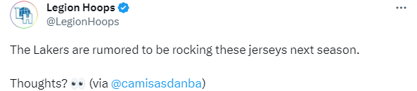 湖人新赛季城市版球衣保留了球队的旧标志,这种三角形模型是在 20 世纪 60 年代,湖人从明尼阿波利斯搬到洛杉矶后不久采用的;美媒Legion Hoops发问,想想湖人新款球衣怎么样?球迷在评论区热议,背面比正面好看;还有球迷表示实际上他们真的很丑以及直言这就是垃圾;还有球迷表示黑色战袍回归,湖人是2024年NBA总冠军。