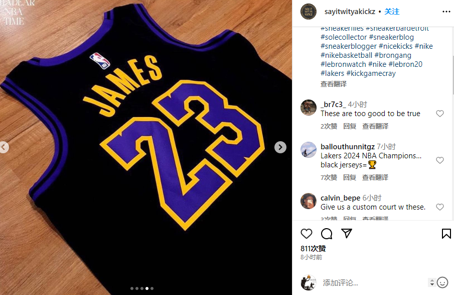 湖人新款球衣引热议!詹姆斯23号实物照曝光:黑色为主紫金为辅