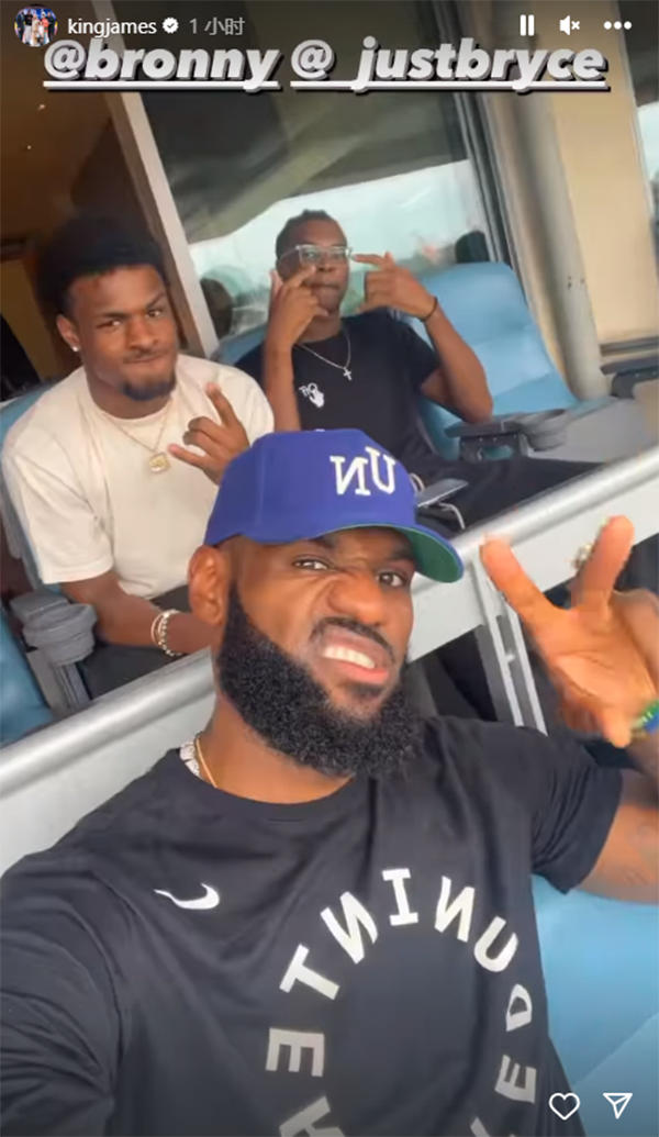 詹姆斯带着蓝色棒球帽,带着老婆萨瓦娜以及两个儿子布朗尼和布莱斯来到道奇主场观看比赛;詹姆斯晒出自己坐在看台的画面,冲着镜头露出歪嘴表情,与布朗尼和布莱斯合影,父子三人都摆出发狠的姿势;詹姆斯还炫耀瑶瑶娃娃,写道:庆祝个人摇头娃娃之夜。