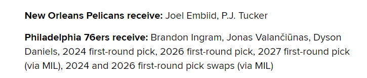 具体的交易方案是鹈鹕把英格拉姆、瓦兰丘纳斯、戴森-丹尼尔斯、2024年首轮选秀权、2026年首轮选秀、2027年首轮选秀(来自雄鹿)、2024和2026年首轮选秀交换权送到76人,得到恩比德和PJ-塔克。