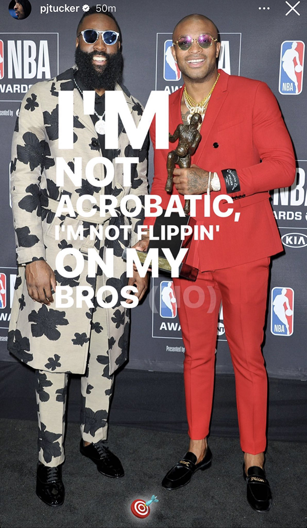 此前哈登的老队友PJ-塔克晒出一张自己与哈登的合照,写道:我不会耍花招,我不会背叛我的兄弟!