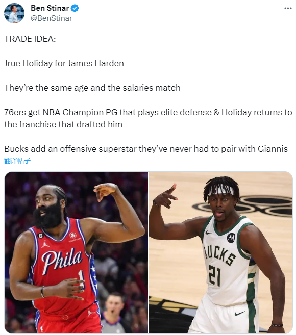 对于哈登的现状,《体育画报》名记Ben Stinar建议哈登单换霍勒迪,该记者表示:哈登单换霍勒迪,他们年龄相同,工资也相匹配,76人队获得NBA冠军控球后卫,霍勒迪防守出色并且重返当初选中他的球队,雄鹿队增加了一位从未与字母哥搭档的进攻巨星。