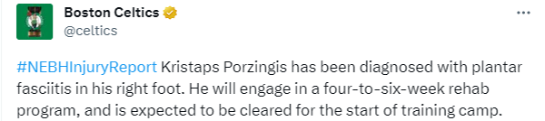 绿军官宣波尔津吉斯因足底筋膜炎接受4-6周的康复治疗,预计将获准参加新赛季的训练营;据此前绿军队记报道,凯尔特人对波神的伤病并不担心。