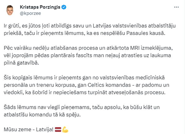 由于遭遇伤病的困扰,波尔津吉斯已经宣布退出世界杯,此前波神正式声明:这很困难,我对自己和支持拉脱维亚的球迷们都很负责,但我已经决定,将不参加本届男篮世界杯了。