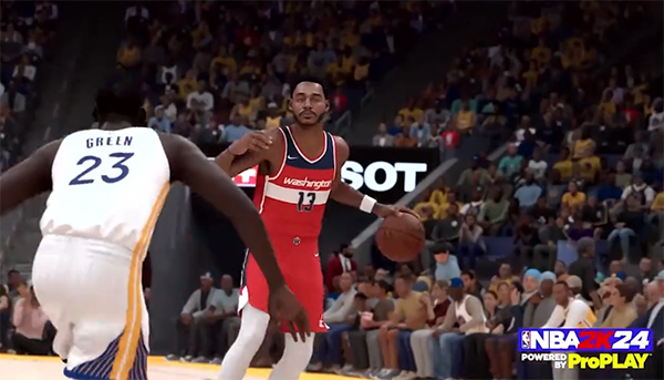 在2K24预告片中,勇士主场对阵奇才,库里持球单挑奇才球员,一连串操作之后命中后撤步压哨三分,库里兴奋地握拳捶地庆祝,整个大通中心都被点燃了。