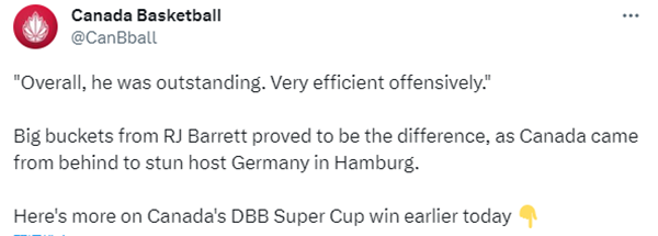 加拿大男篮官方表示巴雷特在球队击败德国的比赛中起到决定性的作用。