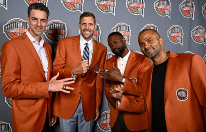 韦德已经正式穿上2023年篮球名人堂的橙色夹克,戴上了入选本届名人堂的荣誉戒指;不久前,韦德与波波维奇、托尼-帕克、诺维斯基和保罗-加索尔一起合影留念,波波维奇走开之后,剩余四人有说有笑继续合影,并且展示他们的名人堂戒指。