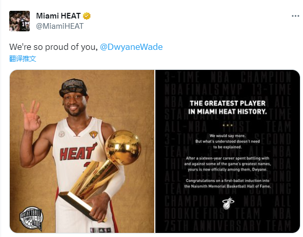 对于韦德入选名人堂,热火官推发表声明祝贺韦德,在声明中写道:我们为你自豪。队史最佳球员!我们本应说更多,但如果你理解那就无需多言。在经过了16年的职业生涯后,在与一些最伟大的球员进行不停对抗后,你现在正式成为了他们中的一员。恭祝你首轮投票就入选名人堂。