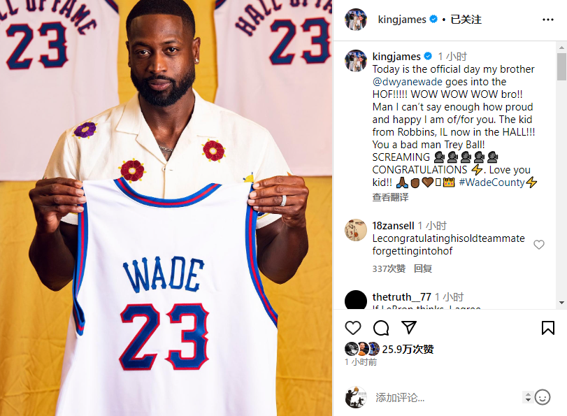 詹姆斯更新社媒,晒出韦德手持23号名人堂球衣的定妆照,配文写道:今天是我的兄弟@韦德正式进入名人堂的日子!!!哇哇哇,兄弟!!我无法表达我为你感到多么骄傲和高兴。来自伊利诺伊州罗宾斯的孩子现在进入了名人堂!你是个坏人,三号!尖叫着恭喜你闪电侠,爱你,韦德之乡。