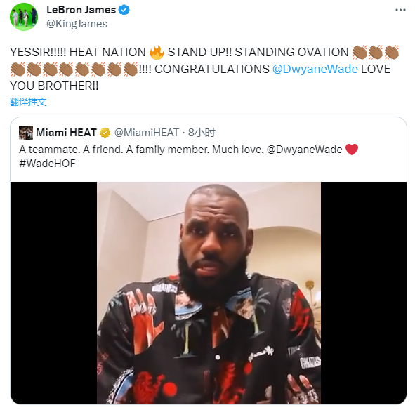 此前詹姆斯曾转发众人祝贺韦德的视频,并且写道:YESSIR !!热火国度! 起立鼓掌(多个鼓掌表情)!!祝贺你@韦德,爱你,我的兄弟!!