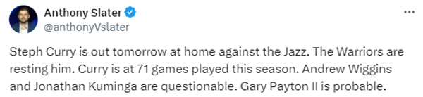 据报道,明天主场对阵爵士,库里将会轮休不打,勇士队让他休息,因为他本赛季已经打了71场比赛;赛季至今,库里场均上场34.2分钟,能够拿到26.5分4.4篮板5助攻,场均命中4.8记三分为联盟第一,本赛季已经命中339记三分球,超越2020-21赛季的自己,创历史单赛季三分历史第四高。