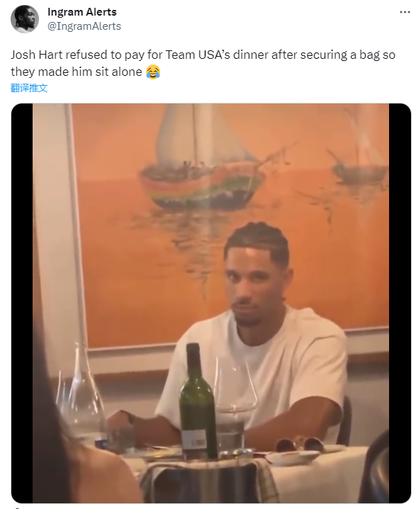英格拉姆的球迷转发布伦森的偷拍视频,配文写道:哈特在拿到新合同后拒绝为美国队支付晚餐费用,因此他们让他独自一人坐着用餐。