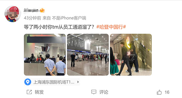 哈登团队的工作人员下了飞机之后看到这么多拿着哈登球衣、标语的球迷们,人数非常多,足以看出哈登在中国的超高人气,哈登的工作人员开始录制视频,并且发布在网上,引发热议。但现场的球迷们一直苦等哈登,结果却不见偶像的到来。