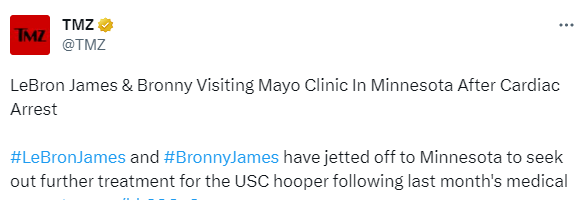 近日詹姆斯现身明尼苏达罗切斯特,他带着布朗尼来到妙佑医疗国际(梅奥诊所)就医,让布朗尼接受进一步的检查,此前布朗尼在训练时遭遇心脏骤停,所幸救治及时,而且布朗尼住院不到48小时就出院回家,究竟布朗尼心脏骤停的原因是什么,这应该就是詹姆斯带儿子来到罗切斯特的原因。
