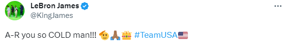 里夫斯冲上推特热搜引热议,詹姆斯发推盛赞里夫斯:A-R,你太冷酷了#Team USA;湖人官方转发里夫斯精彩上篮,也夸赞他。