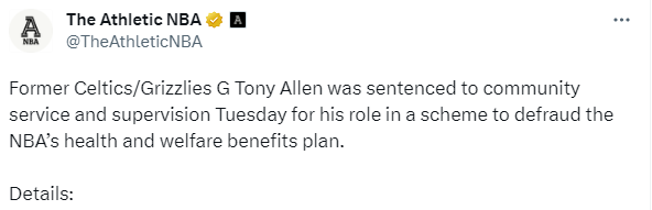2021年,18名前NBA球员被指控从NBA健康和福利计划中骗取约400万美元而被指控,托尼-阿伦就是其中之一,他于今年4月承认参与骗保案,并且面临牢狱之灾,如今托尼-阿伦被判处社区服务,免遭牢狱之灾。