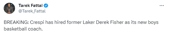 据报道,费舍尔已经正式被聘请担任Crespi高中男篮的新主帅,费舍尔在一份声明中表示:我和我的家人都很感激有机会加入Crespi大家庭。教练和教学是一种真正的热情,我期待着继续关注下一代年轻的学生运动员。