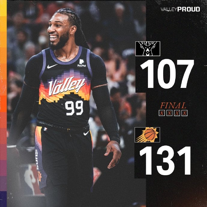 太阳(45-10):艾顿27分7篮板1盖帽、布里奇斯18分2助攻2抢断、保罗17分19助攻7篮板2抢断、布克17分7助攻4篮板、卡梅隆-约翰逊15分8篮板3助攻2抢断、麦基12分4篮板2抢断、克劳德10分8篮板2助攻、比永博9分2篮板、佩顿5分、韦恩赖特1分2篮板。