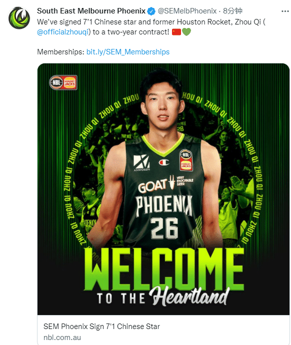 周琦加盟NBL后首次发声:很高兴加盟NBL联赛东南墨尔本凤凰队,这是一支极具潜力,充满朝气的队伍。