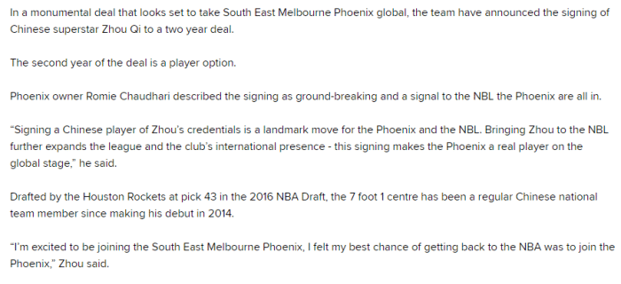 周琦接受采访时表示:我很高兴能加入东南墨尔本凤凰队,我觉得回到NBA的最好机会就是加入凤凰队。