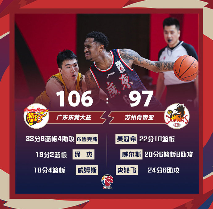 广东(36-4):布鲁克斯33分8板4助、威姆斯18分4板、赵睿11分、徐杰13分、周鹏9分、任骏飞7分。