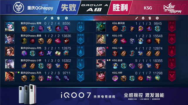 2分30秒,KSG镜击杀孙膑拿下一血。3分26秒,KSG孙尚香中路击杀马超。5分01秒,KSG孙尚香再次击杀马超,随后控下暴君。5分23秒,KSG击杀孙膑。6分59秒,KSG拿下先知主宰。7分17秒,KSG破掉重庆QG下二塔并击杀白起。7分51秒,KSG破掉重庆QG中一塔。8分36秒,KSG破掉重庆QG上二塔。9分01秒,双方团,KSG打出0换3。9分15秒,KSG破掉重庆QG上高地,再次击杀两人后团灭对手,随后一波摧毁水晶赢下比赛!