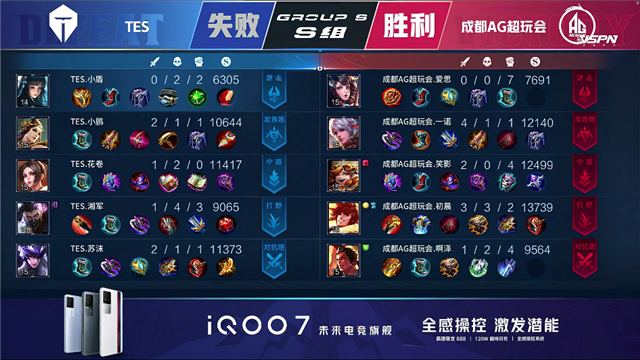 双方和平开局,2分23秒成都AG拿下第一条暴君,4分45秒成都AG拆掉TES下路一塔。5分59秒成都AG上路一塔被破,6分26秒成都AG拿下先知主宰,TES拿下暴君。7分钟中路团战TES打出2换3,拆掉成都AG中路一塔。8分30秒TES击杀成都AG橘右京,10分40秒中路团TES打出0换2,11分05秒TES拿下暗影暴君。12分20秒野区团成都AG击杀太乙真人,12分42秒成都AG拿下暗影主宰。13分16秒成都AG拆掉TES中路一塔,15分10秒野区团TES打出1换3,橘右京天秀击杀姜子牙后被镜击杀。17分钟TES拆掉成都AG上路二塔,17分21秒TES拿下暗影主宰,18分30秒成都AG牛魔被击杀。19分30秒成都AG三路二塔被破,20分34秒团战TES打出0换3,21分04秒TES拆掉成都AG下路高地,成都AG无力防守被一波拆掉水晶。