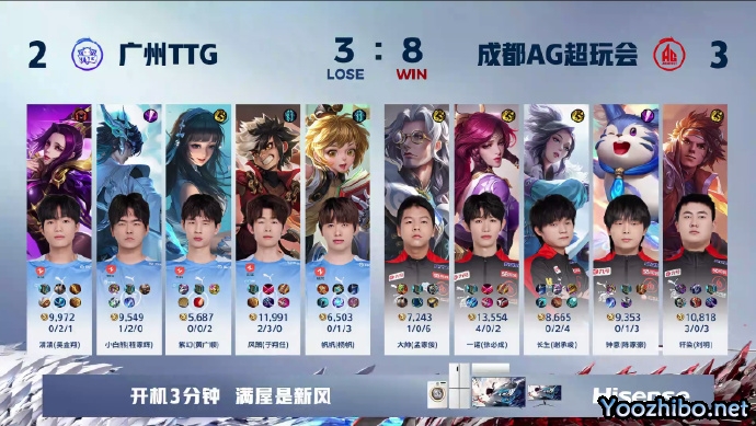 第二局,TTG这把一直在冲一诺的孙尚香,最后的两波团战出现了脱节的情况。AG借机反打拿到经济优势,最后一波直接推掉了TTG的水晶。AG连下两局先到赛点!本局MVP为AG一诺(徐必成)孙尚香!