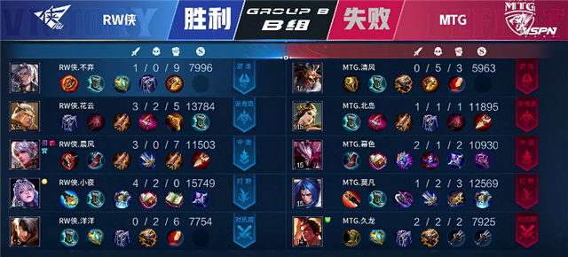 双方平稳开局。1分钟中路河道之灵团战,狄仁杰拿下一血。2分20秒橘右京拿下暴君,太乙真人被击杀。2分53秒橘右京反下蓝buff。4分40秒狄仁杰推掉下路一塔。5分43秒沈梦溪被击杀。6分钟橘右京拿下主宰。6分10秒RW侠强攻中路一塔,团战RW侠打出1换2。8分钟MTG上路一塔被破。8分47秒橘右京推掉下路一塔,狄仁杰推掉上路一塔。10分10秒中路下河道团战,盾山被击杀。11分钟暴君团,太乙真人被击杀,猪八戒拿下暴君。12分20秒RW侠上路二塔被破。12分35秒中路团战,RW侠打出0换2。13分22秒橘右京拿下主宰。14分35秒下河道团战,双方1换1。15分28秒MTG拿下暴君。15分50秒野区团战,MTG打出1换4,马超拿下双杀,MTG顺势推掉中路防御塔。16分57秒RW侠上路高地塔被破。18分钟野区团战,MTG打出0换2。19分钟MTG拿下主宰。19分30秒上路团战,RW侠打出3换4,马超和蒙犽分别拿下双杀。20分钟RW侠推掉中路一塔。21分20秒下河道团战,MTG打出0换4,马超拿下双杀。22分10秒MTG推掉水晶追回一分。