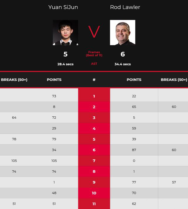 决胜局,劳勒打到了49分,优势很明显,但之后袁思俊上手,单杆51分后出现致命失误,还好劳勒未能打进粉球,但接下来的防守中,劳勒打进粉球和黑球,惊险拿下,袁思俊无缘单局大逆转。
