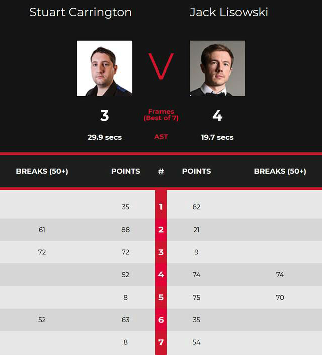 第六局,利索夫斯基率先上手,30-0后转入防守,卡林顿单杆52分、63-35拿下,3-3进入决胜局。决胜局中,利索夫斯基顺利拿下,4-3绝杀。