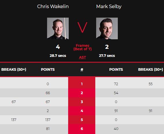 塞尔比一上来状态不错,单杆轰出55分先声夺人。不过第二局韦克林把握机会66-54险胜拿下。之后韦克林单杆轰出67分拿下第三局,塞尔比第四局单杆91分回应。第五局,韦克林火力全开,轰出单杆137分!塞尔比陷入困境,第六局无法找回手感,最终40-81落败,2-4爆冷出局。
